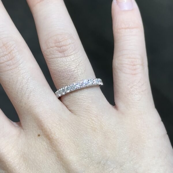 Amelia Eternity Ring is a half eternity ring consisting of round diamonds. It is ideal for engagement ring stacking, as a wedding ring, or worn by itself for a dazzling look.