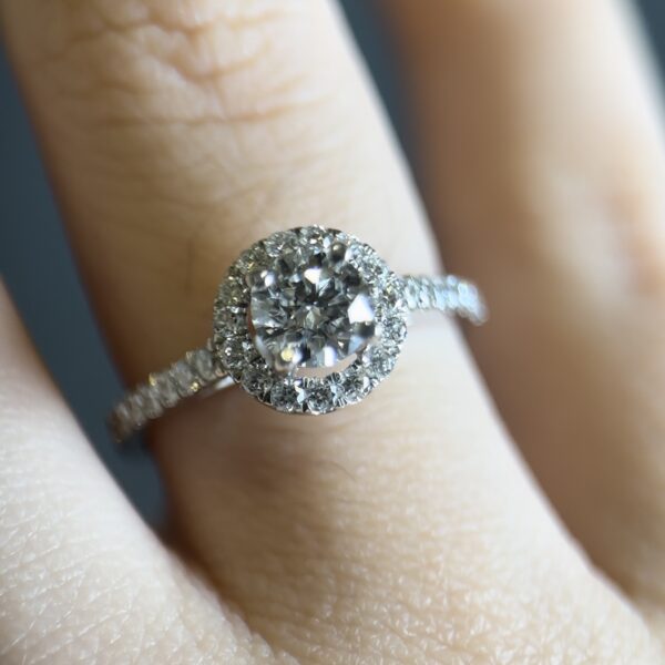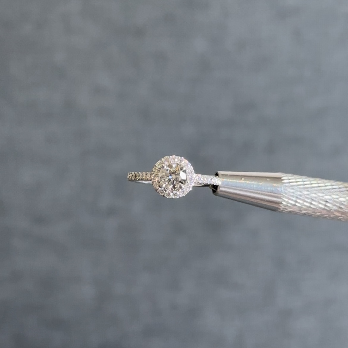 Callie Ring is a luxurious round ring with halo and pave setting, creating an illusion of a bigger carat weight. It is perfect for engagement ring and will give you a unique and elegant look.