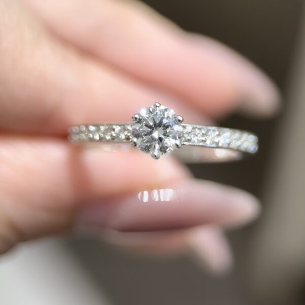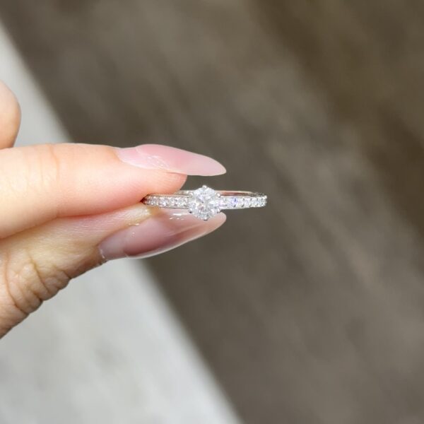 Hazel Ring is a solitaire round ring with pave setting. a classic setting with 6 prongs, border on the sides make the ring stand out and sparkles light & elegance. It will make a perfect engagement ring for sure.