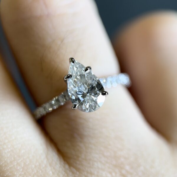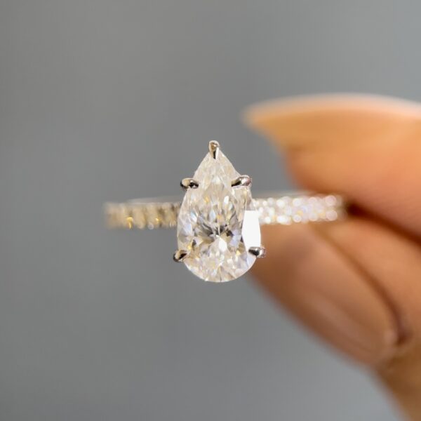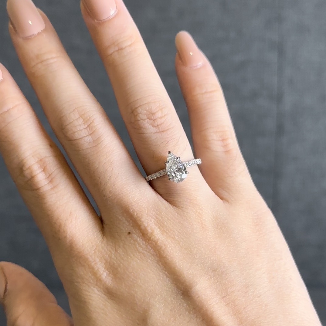 Isabel Ring is a super sparkly pear-shaped engagement ring with pave setting. Perfect for ladies who love fancy shapes, which gives an illusion of elongation for your fingers.