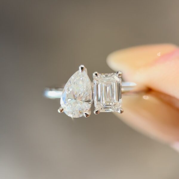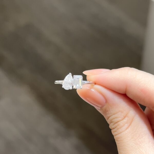 Phoebe Ring is a Toi et Moi ring with pear and emerald diamonds, two popular fancy shapes. Toi et Moi means ‘you and me’, perfect for meaningful engagement ring, or gifts for your loved ones