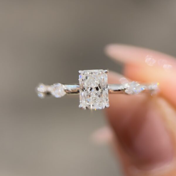 Sandra Ring is a unique radiant ring with hidden halo and marquise side stones. It is a trendy ring, suitable for ladies who love unique and fancy engagement rings.