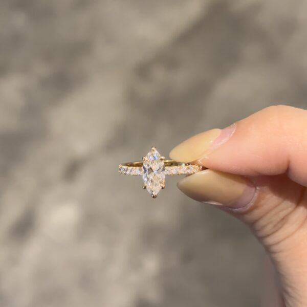 Selena Ring is a marquise shaped ring with pave and with yellow gold color. It is inspired by Selena Gomez’s engagement ring, with 6 prongs making it a perfect ring for you