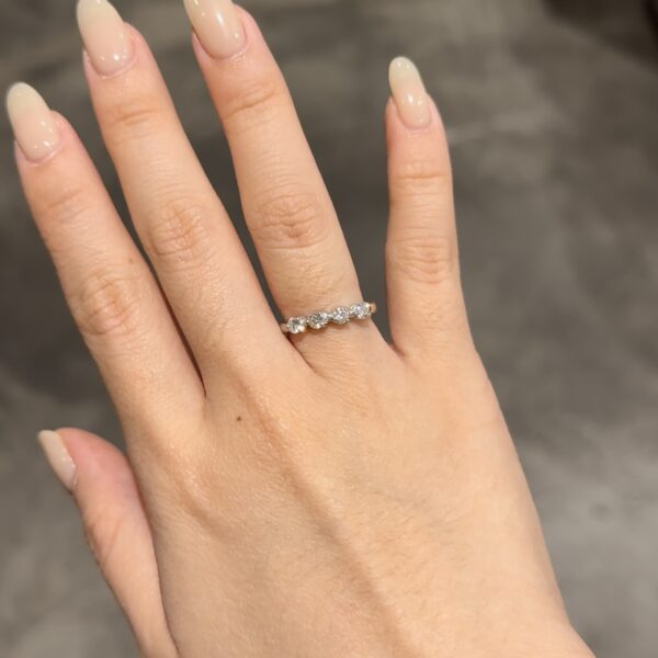 Sofia Ring is an eternity ring consisting of round diamonds with gaps in between. It is suitable for stacking or to be worn by itself.