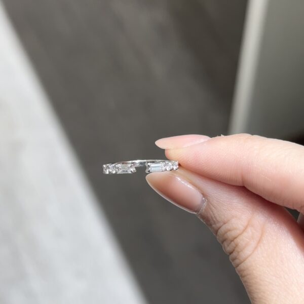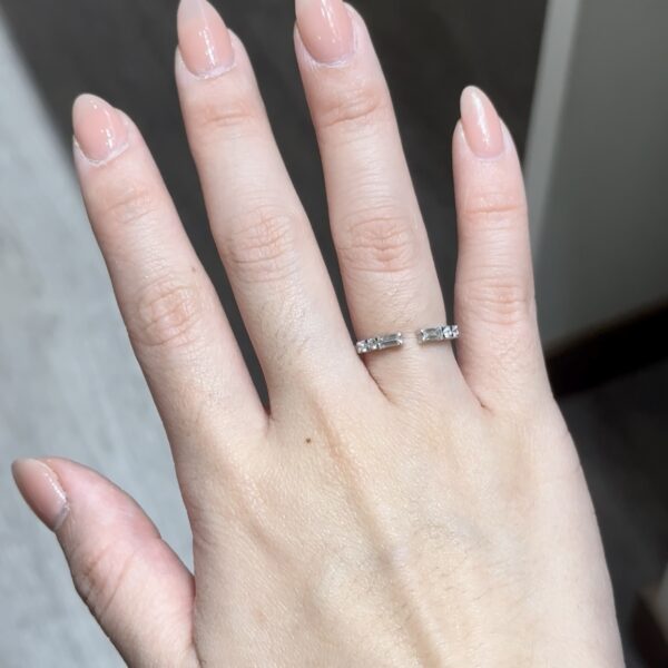 Violet Eternity Ring is an open gap diamond eternity ring with baguette and round diamonds. It is ideal for engagement ring stacking, as a wedding ring, or worn by itself for an elegant, stylish look.